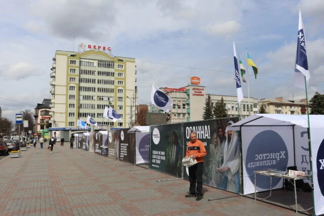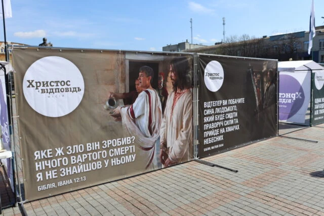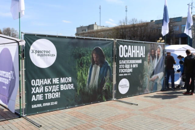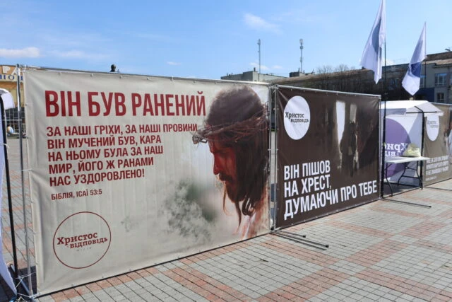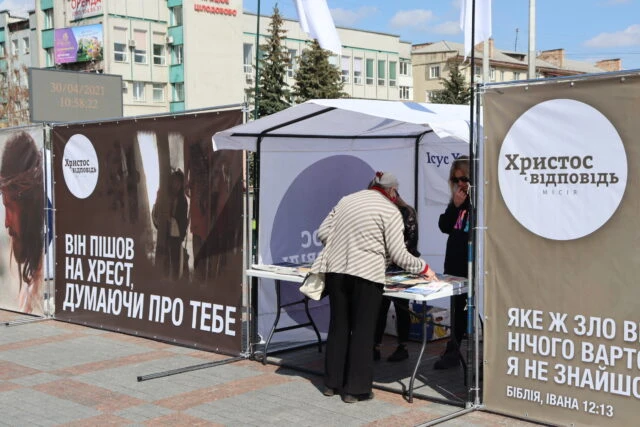 The resurrection of Christ is one of the main events in the history of mankind. To remind the residents of Rivne city of God’s manifestation of love, the community organized an exhibition of banners in the city center. The ministers set up five evangelistic tents, where passers-by could take christian literature, newspapers, calendars, and just ask questions for free. Between the tents there were nine banners with verses from the Bible, which tell about the essence of the Easter holiday. They depict the events that occurred on the eve of the resurrection of Christ.