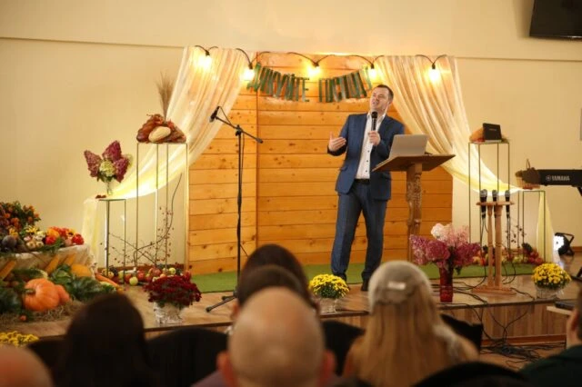 На собрании звучали призывы благодарить Бога за все. Пастор Тарас Сень в центральной проповеди рассказывал, за что нужно благодарить больше всего – за спасение в Иисусе Христе, за то, что Бог нас делает Своими детьми по вере.